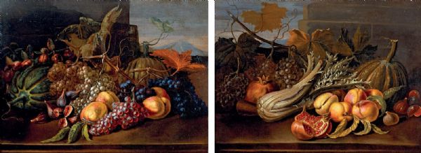 Le tele sviluppano modalità espressive già tipiche di un Michelangelo da Campidoglio negli accostamenti compatti degli oggetti “di ferma” ma anche allargando il campo visivo in ampie prospettive paesaggistiche e riservando attenzione prospettica e luministica al piano d’appoggio (si noti, peraltro, nello squarcio sullo sfondo, nella seconda tela a destra, il profilo montuoso che ricorda il Vesuvio).